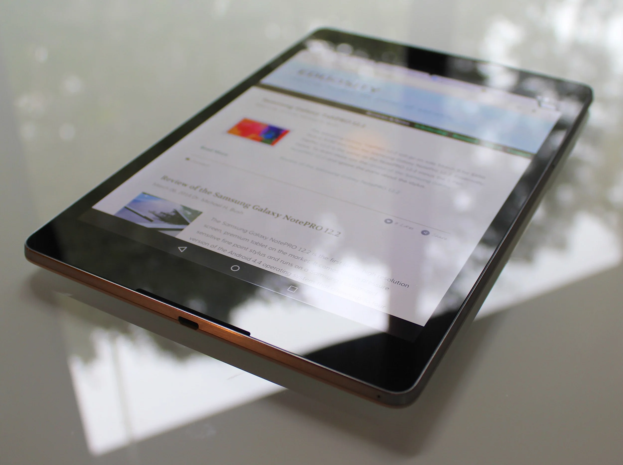 Physically, the Nexus 9 reminds me of the Amazon Kindle Fire HDX 8.9. It is the same screen size and shares the inversely angled edges. Yet holding the Nexus is fairly easy thanks to its relatively flat back and light texturing. When compared to the market leader, iPad Air or Mini it is not as comfortable to hold over long periods of time. Pure weight is not the issue, it weighs 425g (0.94 lb) compared to the 437g (0.96 lb) of the iPad Air 2 and 337g (0.75 lb) of the iPad Mini 3. Weight combined with the angled outer edge degrades the comfort experience over an extended period. The front firing stereo speakers on either side of the screen are a nice addition. While on the tinny side, their placement do make the Nexus 9 easy to listen to. Music, movies, and gaming are enjoyable and benefit greatly from the landscape oriented stereo separation. The Nexus 9 did adopt the 4:3 aspect ratio which makes the screen more proportionally pleasing for reading. In comparison, the Nexus 7 and Nexus 10 had a 16:9 ratio that was proportionally optimized for video consumption.