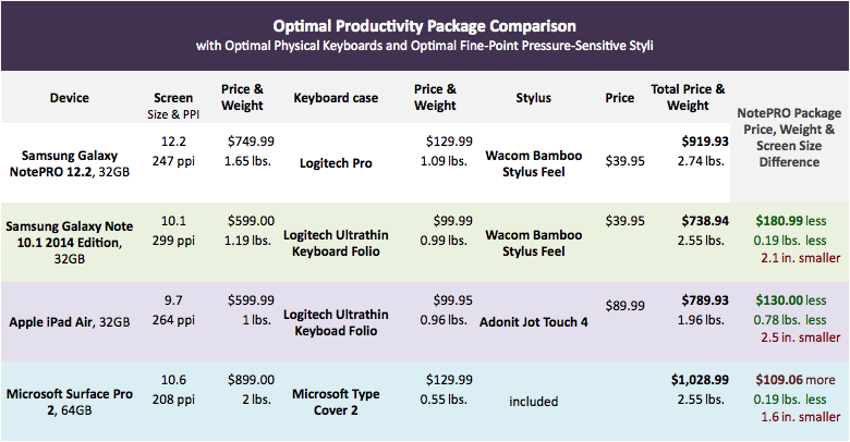 Click to enlarge. Optimal Productivity Package Comparison, with physical keyboards and optimal fine-point pressure-sensitive styli
